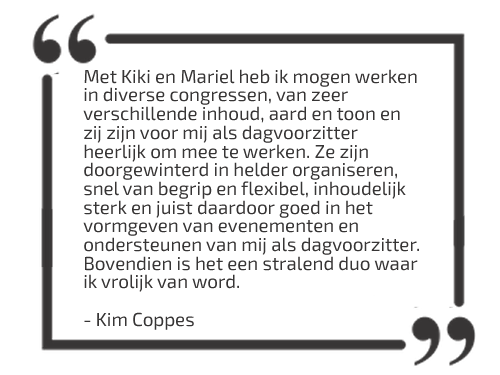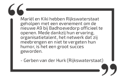 Wij, Mariël Imthorn en Kiki van Oeffelen hebben samen ruim 20 jaar ervaring in het bedenken, organiseren, begeleiden en uitvoeren van evenementen. Gedurende onze carrière werkten we eerder regelmatig en intensief samen. De persoonlijke klik en zakelijke chemie smaakte naar meer! We besloten onze vleugels te spreiden en als ondernemers nog meer de breedte van ons vak op te zoeken.